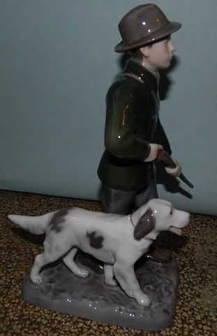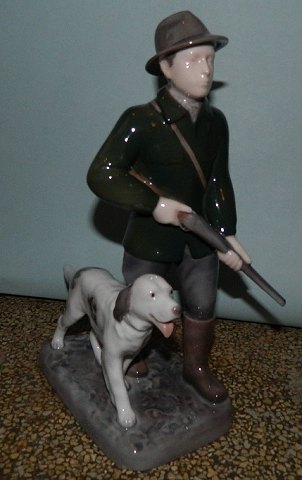 Figur i porcelæn af jæger med sin hund fra Bing & Grøndahl. Skabt af Svend Jespersen. Model nummer 2328. I perfekt stand. 1. sortering. 24 cm høj