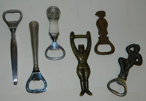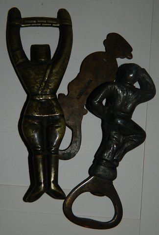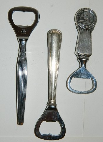 Tre øloplukkere i sølv. Øloplukker forestillende Hitler, undergrundsarbejde fra 1940-45 (SOLGT), avisdreng af K.B. samt figurativ oplukker af mand med ølflaske. Den længeste proptrækker i sølv er 14 cm lang.