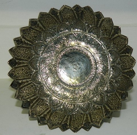 Skål i sølv på fod. Fremstillet i Persien i 19. århundrede. Fremstår i perfekt stand. Hverkan sølvstemplet eller fabriksmærket. Metallet er dog tested, hvorfor der medfølger garanti for at metallet er sølv. Ca. 110 gram. Ingen skader eller reparationer. 10½ cm høj. Åbningsdiameter 14½ cm. Bundens diameter er 8½ cm.