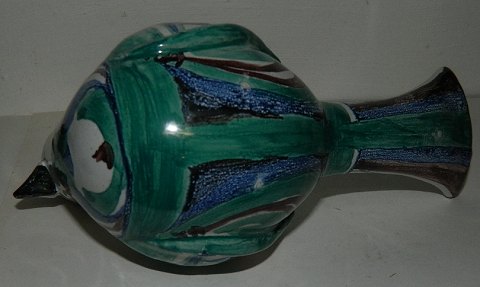 Figur i fajance af fugl. Dekoreret i tre farver. Ikke signeret, men den er med sikkerhed designet af Bjørn Wiinblad. Fremstår i perfekt stand. Figuren kan stå men er ligevel beregnet til at hænge - øsken på ryggen til ophæng. 13½ cm høj og 19½ cm lang. HOVEDET DREJER TIL HØJRE.