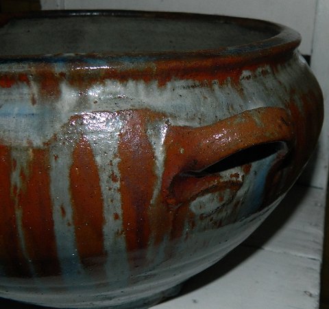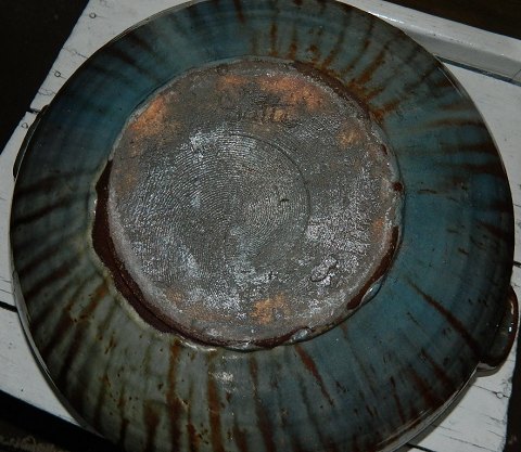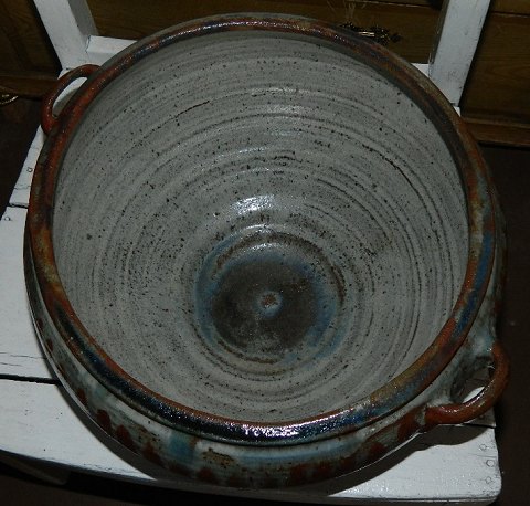 Large bowl with handles in ceramics by Gutte Eriksen (1918-2008). Ribbed painted decoration. Glazed inside and outside. In perfect condition. Signed "Gutte" on the bottom. 19½ cm high. Opening Diameter 29½ cm.