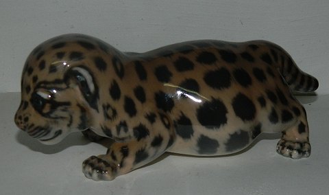 Figur i porcelæn af jaguar unge. Udført af billedhugger Jeanne Grut (f. 1927). Fremstår i god stand. 1. sortering. Har dog glasurfejl ved begge ører. Ubekendt navn anført under fabriksmærket. 8 cm høj og 22 cm lang.