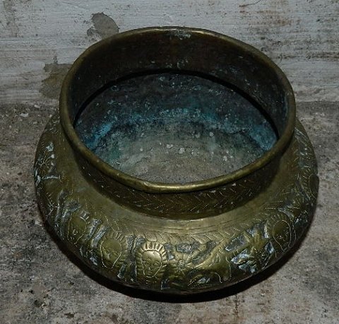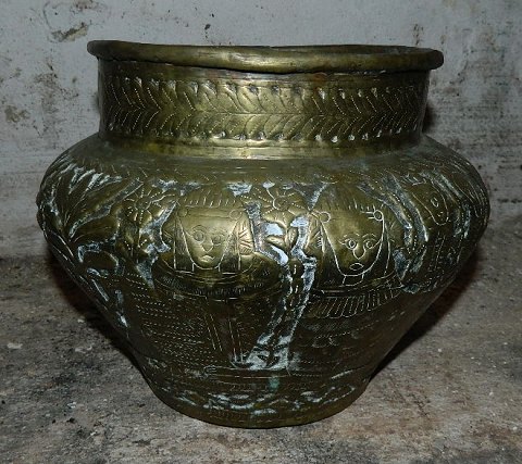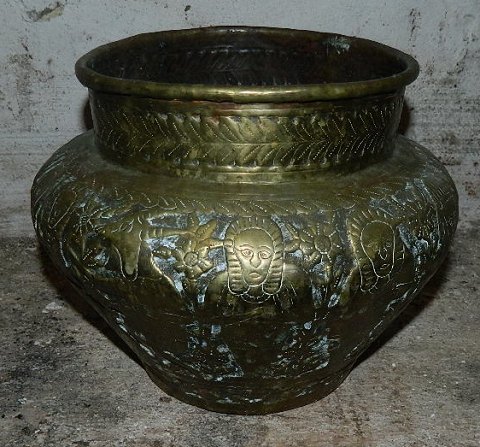 Blomsterkrukke i kobber fra mellemøsten fra ca. 1900. Dekoreret me ægyptiske dekorationer. I god stand med almindeligt brugsslid. 20 cm høj. Diameter på 24 cm