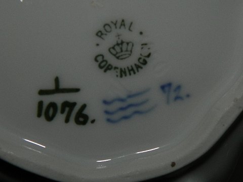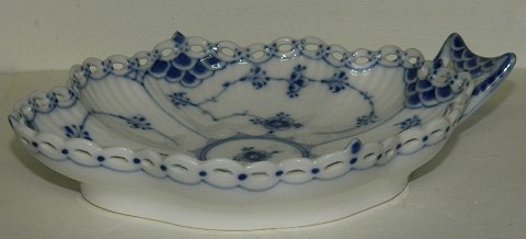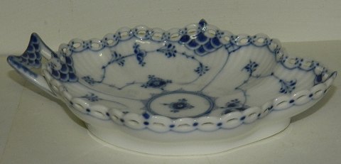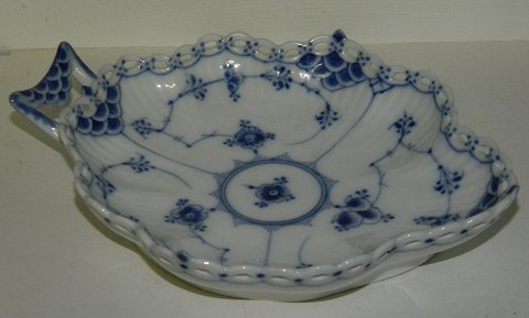 Fiskeformet fad i helblonde musselmalet porcelæn fra Royal Copenhagen. 1. sortering. Modelnr. 1/1076. Mål: 3½ cm høj, 18½ cm lang.