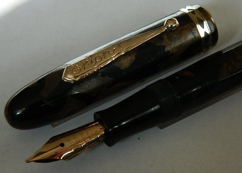 10-sidet brun/sort marmoreret Orion Everlasting no. 563 fyldepen. Push button fylder. Ny gummisæk skal indsættes før brug. I god stand. Uoriginal Orion nib (Parker). 13½ cm lang.