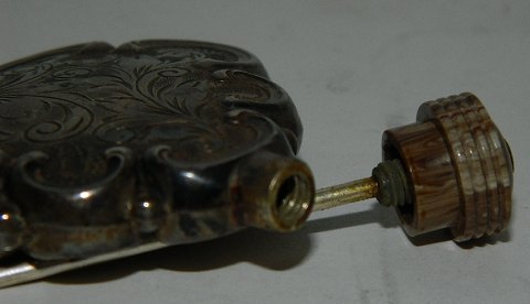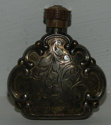 Lille parfume flacon i sølv med prop. Sølvstemplet samt mesterstemplet. 19. århundrede. Fremstår i god stand uden skader eller reparationer. Kan ikke stå. 5½ cm høj.