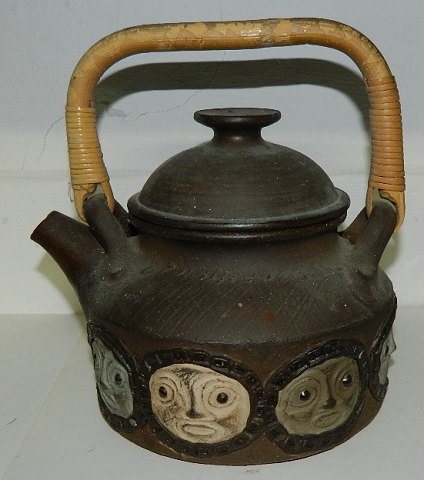 Tepotte i keramik med hank af bambus. Dekoreret med hovedet. Fremstillet hos Dybdal værksted i Danmark i 1972. Signeret af ubekendt kunstner. Fremstår i perfekt stand. 19 cm høj.