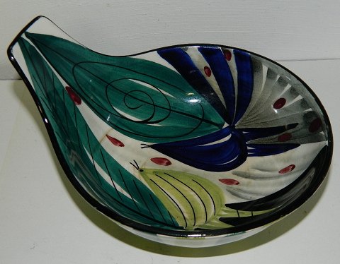 Farverig skål i fajance fra Stavangerflint i Norge designet af Inger Waage. Fremstår i perfekt stand. Fabriksmærket og kunstnerinitialer I.W. på bunden. 9½-10 cm høj og 16 cm i diameter.