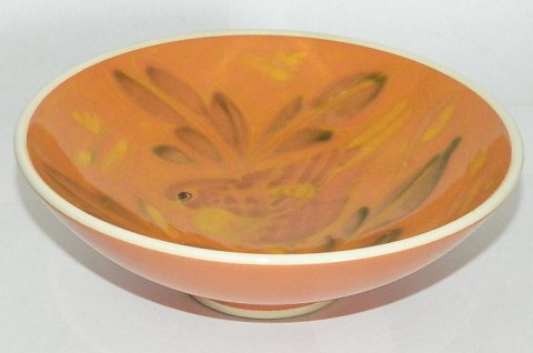 Unika skål på fod i fajance fra Aluminia. Udført af Nils Thorsson (1898-1975). Dekoreret med fugl i bunden af skålen. Fremstår i perfekt stand. 1. sortering. Signeret af kunstneren på undersiden under fabriksmærket. 6 cm høj og 18 cm i diameter.