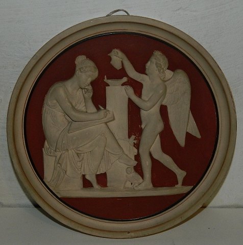 Tre svævende engle (Tro, Håb og Kærlighed) af Bertel Thorvaldsen, der modellerede denne i Rom i 1805. Kopi i bisquit for Bing & Grøndahl i katalog 1866. Platten her er således produceret mellem 1866-1900. Fremstår i perfekt stand. 32½ cm i diameter. Er også lavet i en midre udgave for Royal Copenhagen.