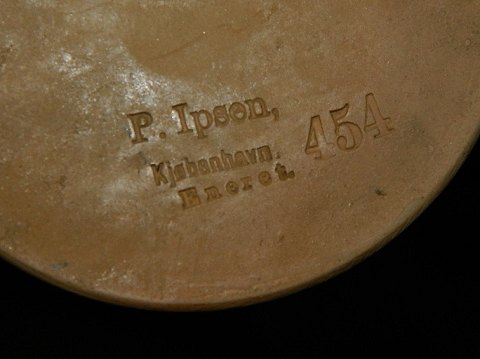 Bertel Thorvaldsen motiv på platte fra Peter Ipsen. Fremstillet i teracotta omkring 1880. Fremstår i perfekt stand. Fabriksmærket på bagsiden. 8 cm høj og 6½ cm bred.
