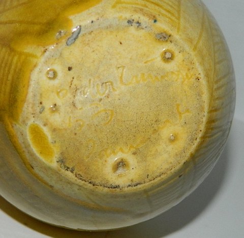 Vase i keramik af Peder Rasmussen. Gult glaseret med indridset dekoration herunder. Fremstår i god stand. Kunstnersignatur på bunden. 10½ cm høj. Diameter på 10 cm.