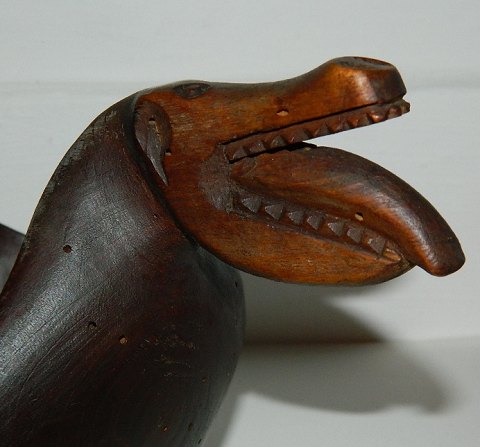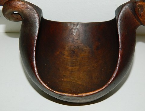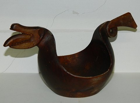 Ølbolle i form som drage. Skåret i et stykke træ. Ingen skader. Almindeligt brugsslid samt ormehuller. 19. århundrede. 14 cm høj og 26 cm lang.