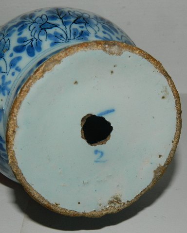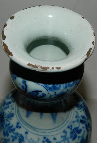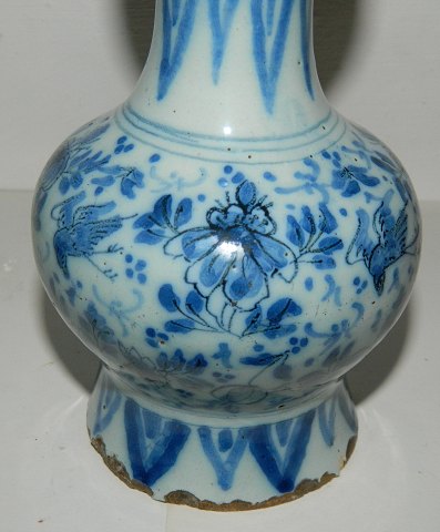Hollandsk delft vase med blå dekoration. Blomster og bladværk samt fugle. Fremstillet første halvdel af 19. århundrede. . Der er hul i bunden. Ellers almindeligt brugsslid. 18 cm høj.