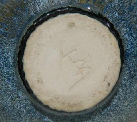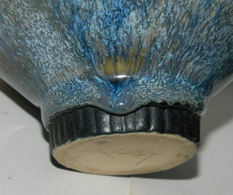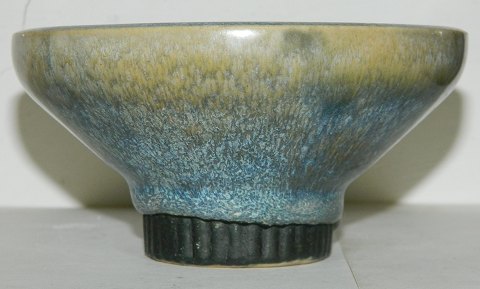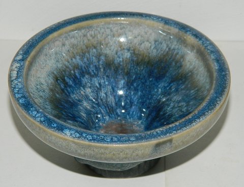 Skål på fod i stentøj af Knud Basse (1916-1991). Glaseret i usædvanlig glasur fra KB´s værksted i Vang på Bornholm. Fremstår i perfekt stand. 6½ cm høj og 12 cm i åbningsdiameter. Signeret af kunstneren på bunden.