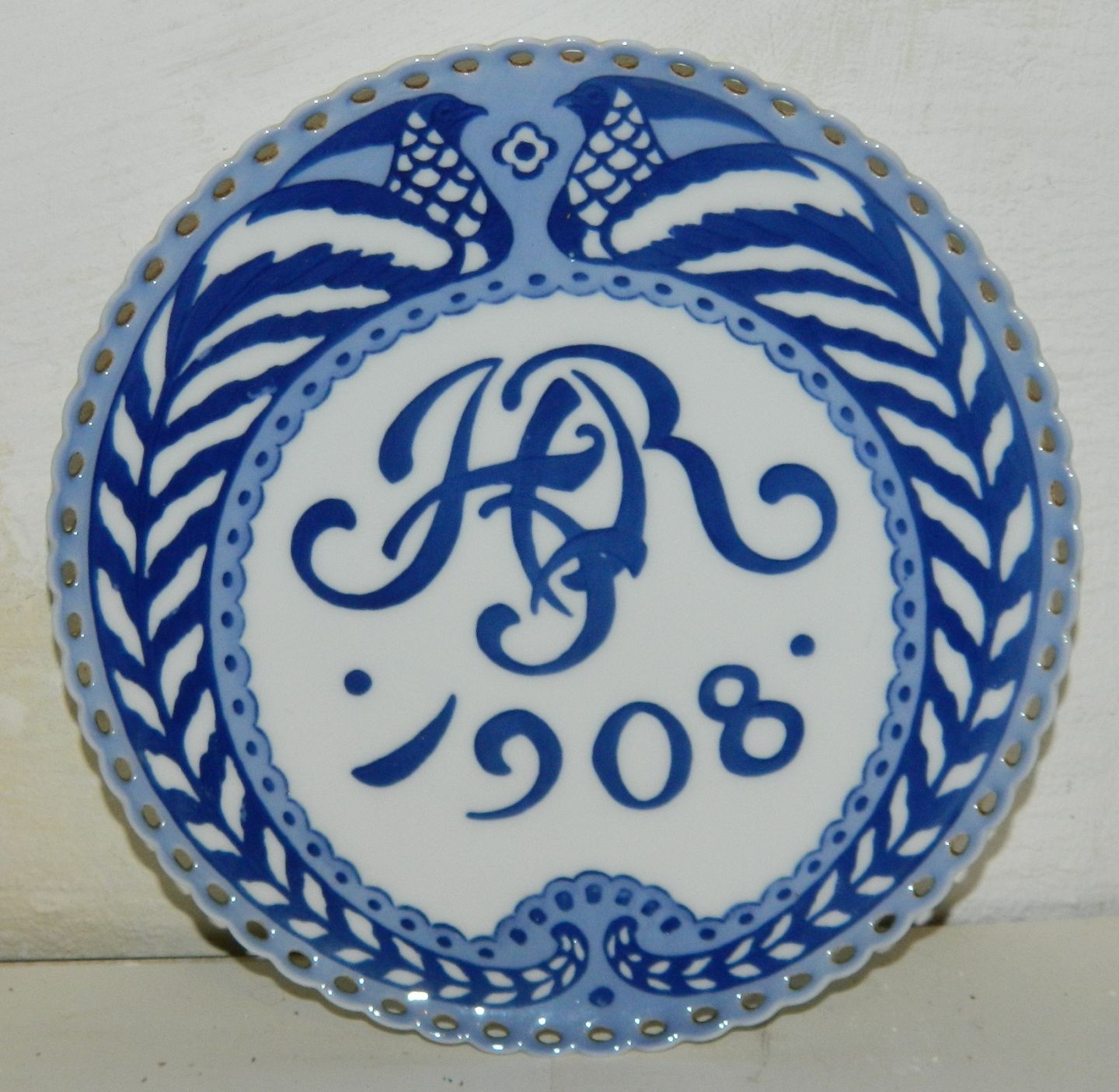 ERINDRINGSPLATTE I SKØNVIRKESTIL: Platte i porcelæn fra Royal Copenhagen. Fremstillet for Hotel- og Restaurationsforeningen i 1908. Fremstillet i 300 eksemplarer. Fremstår i perfekt stand. 1. sortering. Fabriksmærket på bagsiden. 20 cm i diameter