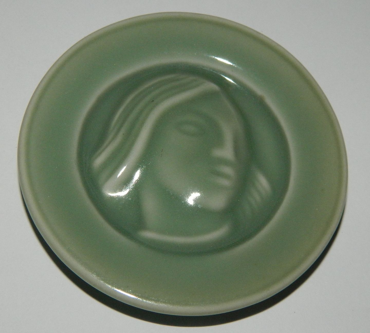 Plakette i stentøj fra Royal Copenhagen. Dekoreret med hoved. Dækket af grøn celadon glasur. Designet af Jais Nielsen. Fremstår i perfekt stand. 1. sortering. Fabriksmærket på bagsiden sammen med kunstnersignatur. 8 cm i diameter.