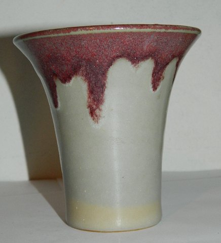 Vase i keramik fra Lauritz Hjorth, Bornholm fra skønvirkeperioden. Grå med rødlig løbeglasur. Udført af Hans Adolf Hjorth (1878-1966). Fremstår i perfekt stand. Fabriksnavn samt kunstnersignatur på bunden. Emne når 100 i 1909. Vasen er 11 cm høj.