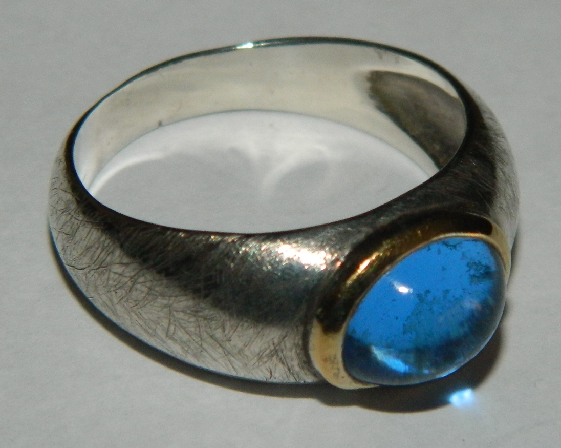 Sterling sølvring med blå sten. Guld omkring stenen. Stemplet JAa 925.