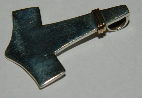 Vedhæng i sterling sølv i form af Thors hammer. Lille guldbåndsdekoration. Stemplet 925 samt PD. Godt 3 cm lang.