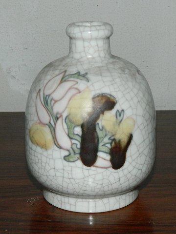Vase i porcelæn med skønvirkemotiv af Effie Hegermann-Lindencrone (1860-1945) for Bing & Grøndahl. Dekoreret med blomster ovenpå krakkeleret glasur. Fabriksmærket sammen med kunstnersignatur på bunden. 12 cm høj.