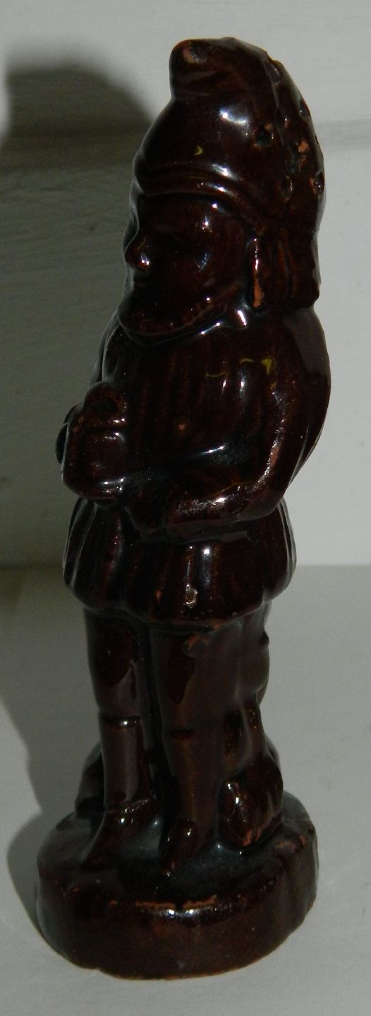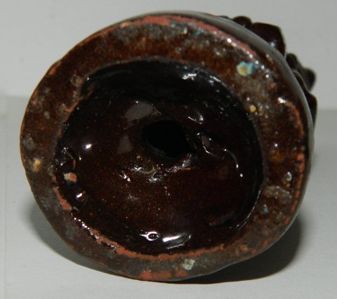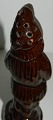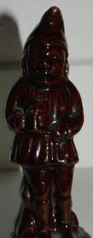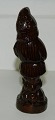 Figur i keramik af nisse som peberbøsse. Dækket af brun glasur. Fremstilet på Bornholm omkring 1900. Fremstår i god stand uden skader eller reparationer. 13 cm høj.