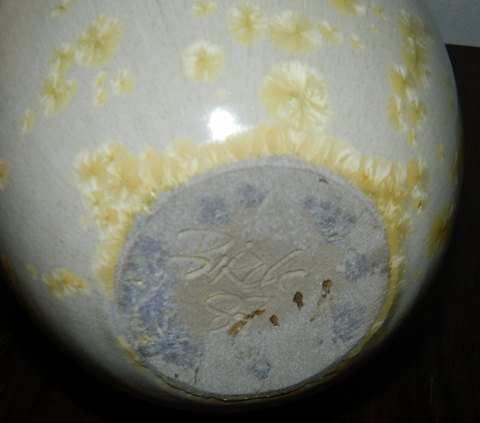 Vase i keramik af Aage Birck fra 1987. Dekoreret med gul/cremet krystal. Fremstår i perfekt stand. Signeret: Birck 87. Vasen er 26 cm høj.