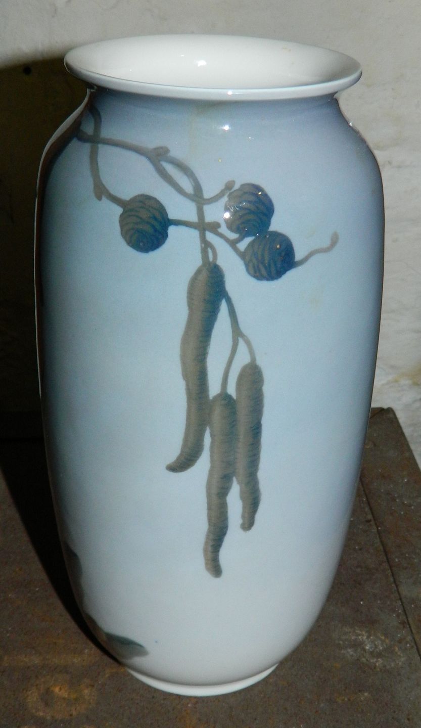 Vase in porcelain by Bing & Grondahl from the middle of the 20th. century. Decorated with pine cones and flowers. In good condition with no damage or repairs. Factory second production. Factory marks on the bottom. 24 cm high.