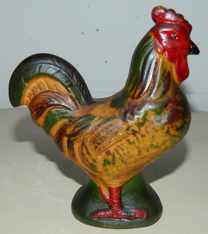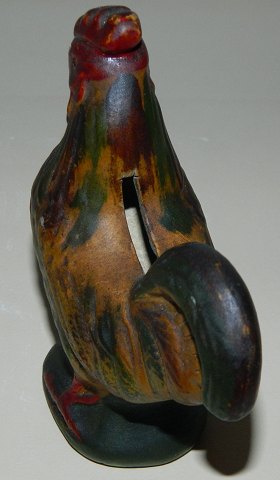 Dansk fremstillet sparebøsse i bemalet keramik af hane. Fremstillet omkring 1900. Fremstår i god stand uden skader eller reparationer. 13 cm høj.