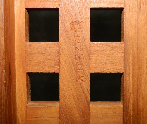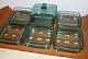 Bakke i teak hvorpå der står seks skåle i glas. Èn med låg. Alle dele i god stand uden skader eller reparationer. Fremstillet ca. 1970 af Jens Harald Quistgaard. Bakken er på bagsiden stemplet IHQ DENMARK. Mål: Bakken er 46½ cm lang og 23½ cm bred. Skålene måler 11 cm x 11 cm. Lågskålen er 10 cm høj.