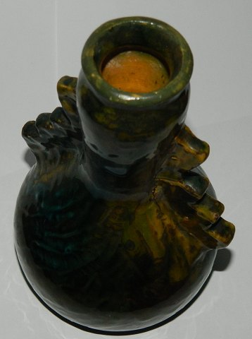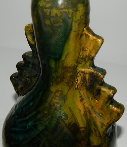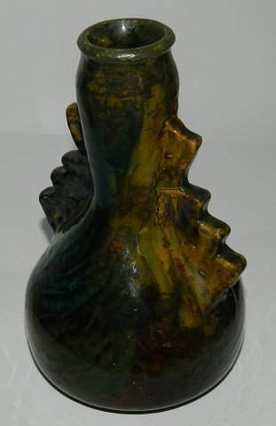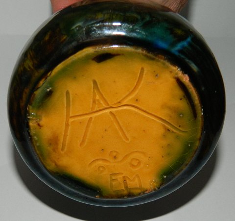 Usædvanlig vase i keramik fra H. A. Kähler fabrikken i Næstved fra omkring 1920. Dekoreret med "drage-takker" på skuldrene. Dækket af grønlig marmoreret glasur. Fremstår med et par brændingsrevner samt lille glasurafslag. Ellers i god stand. Vasen er formentlig unika-arbejde af (for mig) ubekendt kunstner - signatur E. M. under det velkendte fabriksmærke HAK. Vasen er 17 cm. høj.