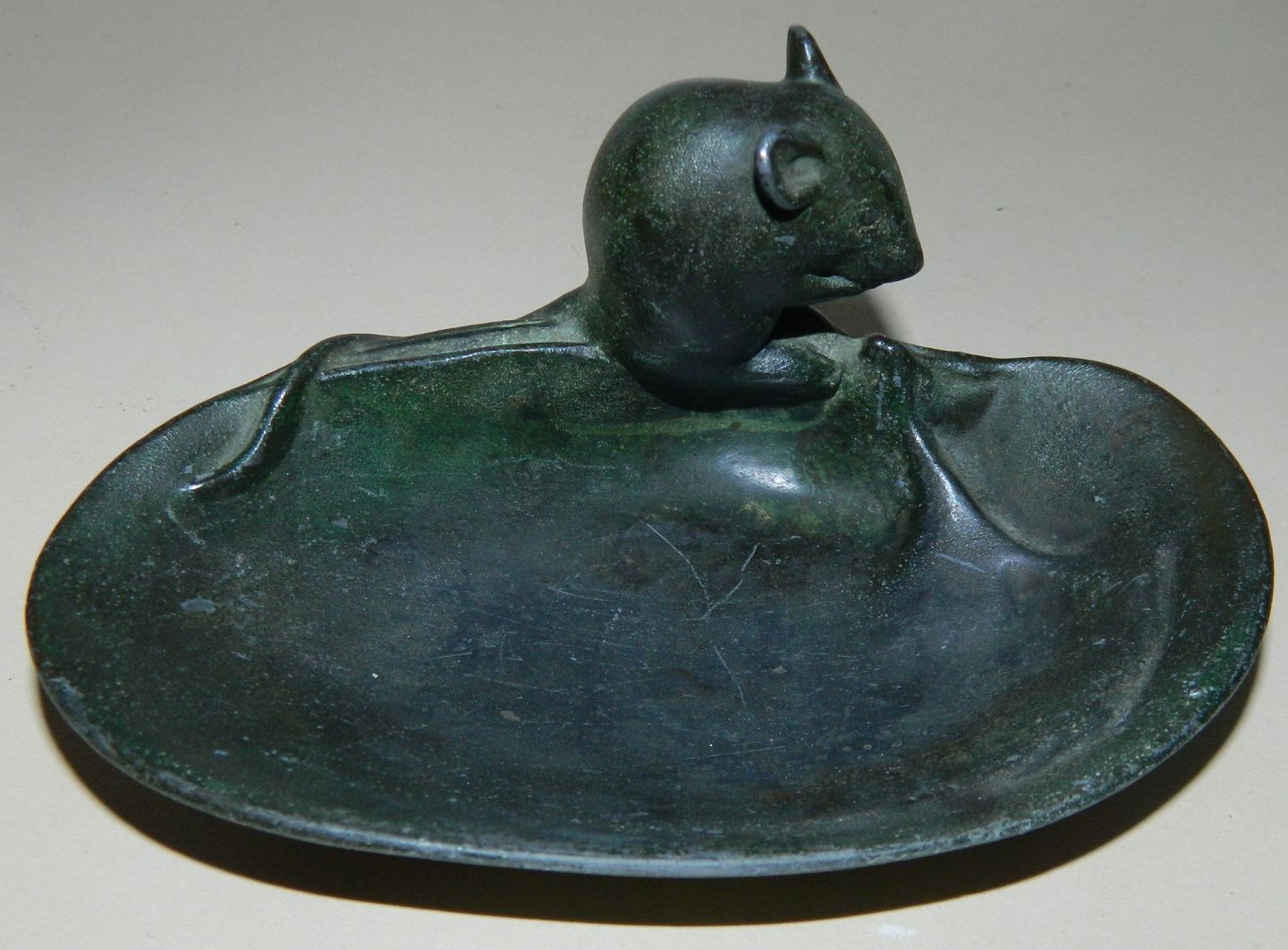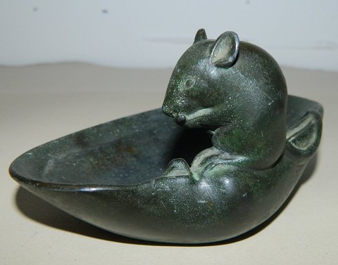 Figur af mus på askefad i metal fra skønvirkeperioden i Danmark omkring 1920. Fremstår i god stand med almindeligt brugsslid. På bagsiden stemplet DANOMETAL W. GREEN MADE IN DENMARK. 6½ cm høj - fadet er 13 cm langt.