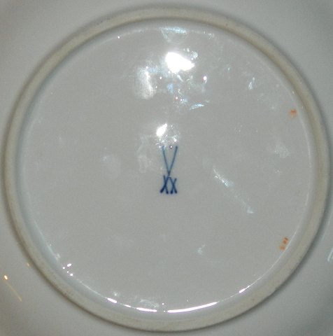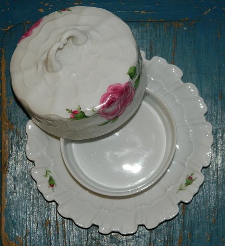 Smørskål i porcelæn fra Meissen fra omkring 1920. Fremstår i god stand. Dekoreret med håndmalet roser. Fabriksmærket på bunden. Par ridser henover sværdene. 10 cm høj - Underdelens ydre diameter er 20 cm.