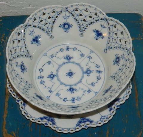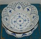 Helblonde musselmalet frugtskål i porcelæn med tilhørende underfad i fra Royal Copenhagen. Fremstår i god stand uden skader eller reparationer. Skålen, modelnummer 1/1061, er 2. sortering. Fadet, modelnummer 1/1062, er 1. sortering. Mål: Skålen er 9 cm høj og øverst diameter på 23 cm. Fadet er 25½ cm i diameter.