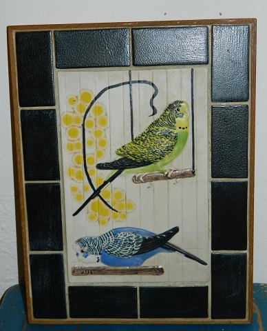 Wall relief in tiles with decorations of two budgerigars from Royal Copenhagen. Designed by Jeanne Grut. In good condition with no damage or repairs. Factory mark on the back. Measures: 24½ cm x 32½ cm.