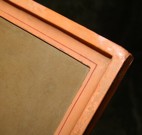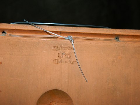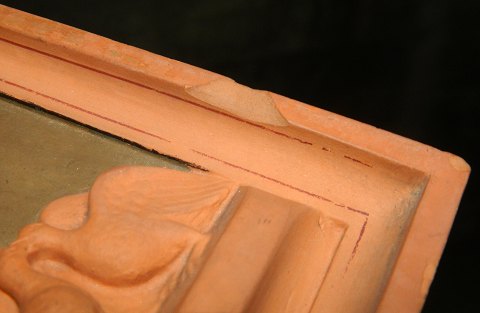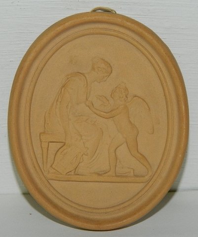 Platte i terracotta fra Peter Ipsen, Kjøbenhavn, med Bertel Thorvaldsen motiv: "Amor beklager sig for Venus over stikket af en bi.". Der ses flere mindre skår på platten hvilket fremgår af fotografier. Fabriksmærket på bagsiden. Mål: 22 cm x 23½ cm
