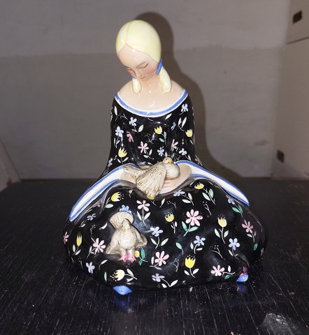 Krukke med ørehanke af Gutte Eriksen. Dekoreret med lange blå vertikale "tunger" - rundt om krukken. Ingen skader eller reparationer. Kunstnersignatur Gutte DANMARK på bunden. Krukken er 11 cm høj.
