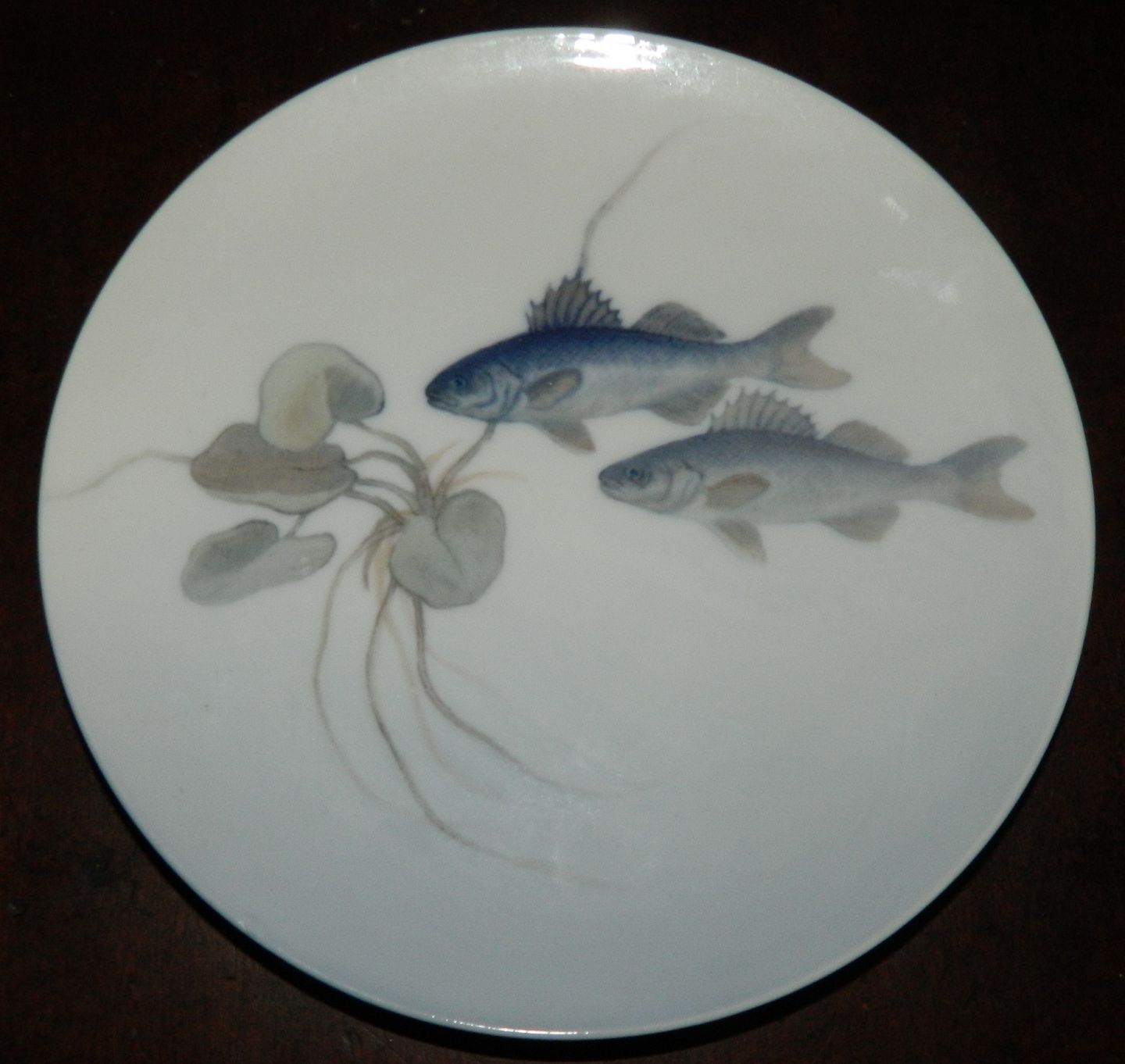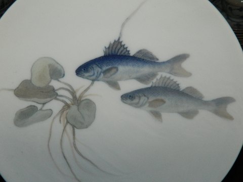 Platte i porcelæn fra Royal Copenhagen med motiv af at par fisk. Fremstår i god stand. Fremstillet mellem 1900-1923. Fabriksmærket på bunden. Platten måler 20 cm i diameter.