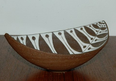 Bådformet skål i keramik udført af Thomas Toft på hans eget værksted i Bisserup, Danmark. Skålen er dekoreret med mønster i hvid glasur. Kunstnersignatur på undersiden. Fremstår i perfekt stand. Mål: 7½ cm høj, 18½ cm lang og 13½ cm dyb. TT har fremstillet keramik på sit eget værksted i mere end 50 år fra 1952.