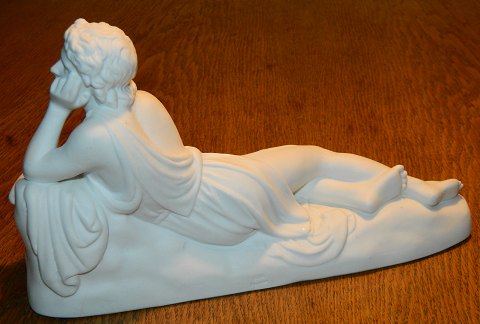 Figur i bisquit af liggende yngling. Modelleret af Bertel Thorvaldsen i Rom 1821-22. Denne reproduktion udført hos Bing & Grøndahl i slutningen af 19. århundrede. Figuren hører til figurfrisen (ses over Vor Frue Kirke´s indgangsparti) "Johannes Døberens prædiken". Fremstår i perfekt stand. Fabriksmærket på bagsiden af basen med B&G samt ENERET. 26 cm lang og 14 cm høj.