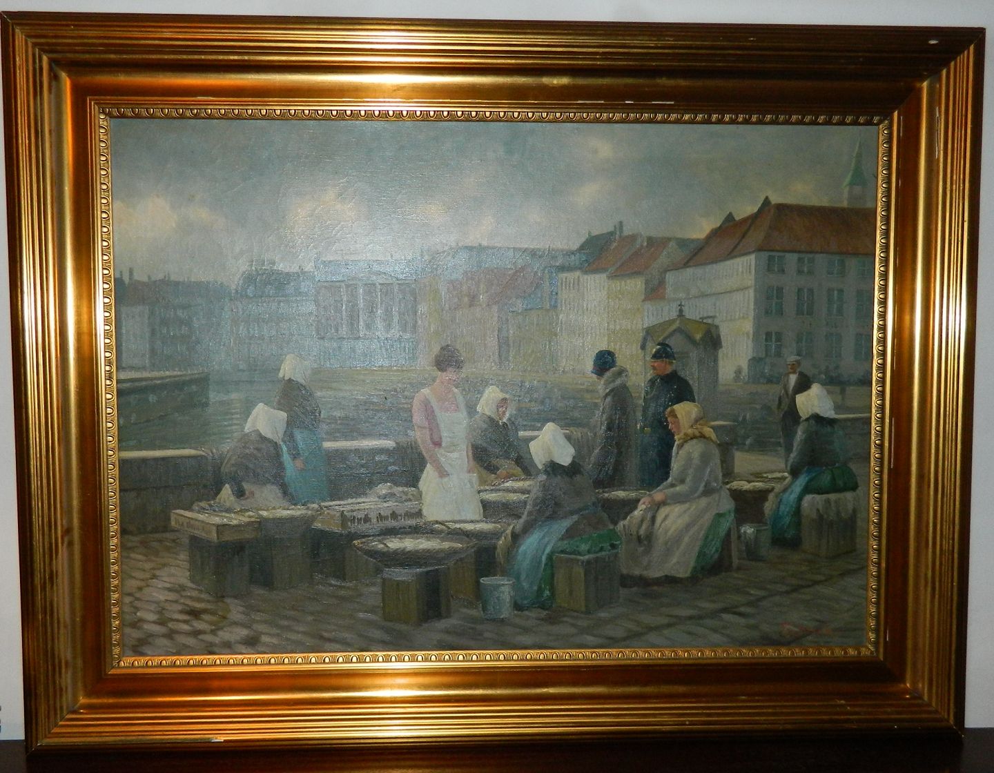 Oliemaleri på lærred med motiv fra Gammel Strand i centrum af København. Bl.a. fiskekoner og politibetjent. Ramme og lærred fremstår i god stand. Signeret H. A. Brinck. Denne signatur brugte C. S. Bjulf ofte på sine malerier