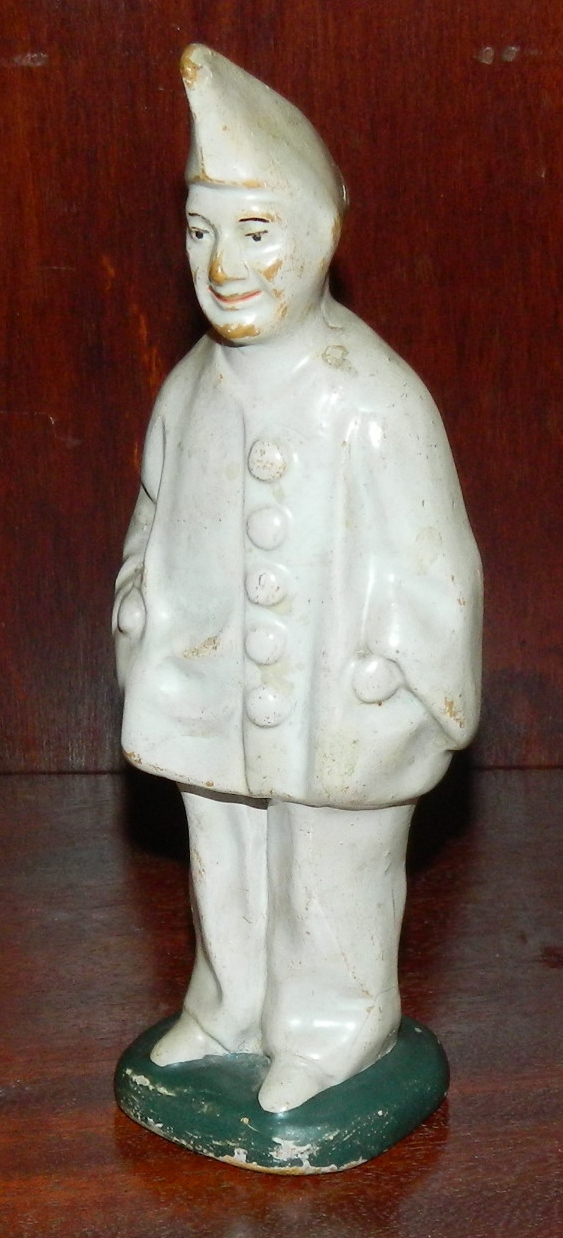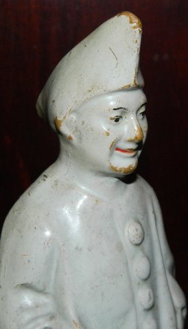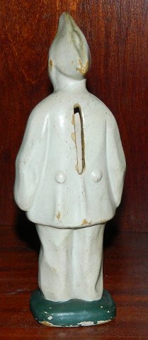Sparebøsse af Pjerrot i keramik. Fremstår i god stand uden skader eller reparationer. Almindeligt brugsslid på overfladen hvilket fremgår af fotografierne. Figuren er 18 cm høj.