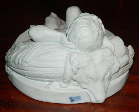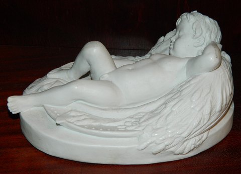 Figur i bisquit af Den sovende kong Skjold som Barn af Th. Stein for Royal Copenhagen i slutningen af 19. århundrede. Figuren har et par produktionsrevner bl.a. ved højre ankel. Ingen skader eller reparationer. Fabriksmærket på bagsiden af soklen med de velkendte tre bølger for Den Kongelige Porcelænsfabrik eller Royal Copenhagen. Mål: 8½ cm høj og 19½ cm lang.