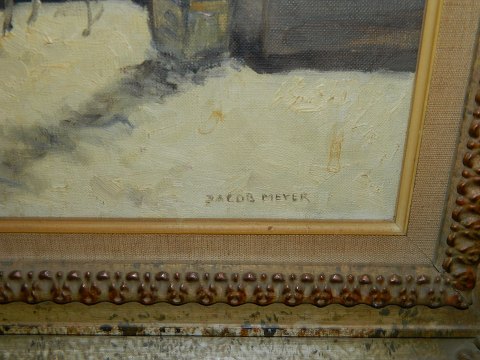 Oliemaleri på lærred af Jacob Meyer (1895-1971). Motiv med snedækket gårdmiljø fra København, nærmere Nørrebro. Malet ca. 1940. Lærred og ramme i god stand. Signeret af kunstneret i nederste højre hjørne. Mål: Incl. ramme 62 cm x 71 cm. Uden ramme: 45