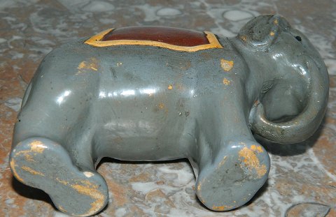 Bemalet figur af elefant som sparebøsse fra 1930´erne. Fremstår i god stand med nogen brugsslid - hvilket fremgår af billederne. Ingen afslag - bortset fra et par små afslag ved åbningen - eller alvorlige skader eller reparationer. 9 cm høj og 13 cm lang.