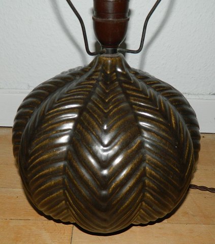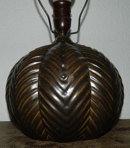 Art Deco fra MA&S: Lampefod i keramik. Tilskrives produkt fraMichael Andersen & Søn på Bornholm. Fremstillet omkring 1940. Brunt bemalet henover fiskebens dekoration i relief rundt om lampen. Åben bund - Hul indvendigt ! Ingen skader eller reparationer. Indridset modelnummer indvendigt. Ingen fabriksmærke. Fremstår i perfekt stand. Mål: - incl. fatning 40½ cm - 21 cm i diameter.