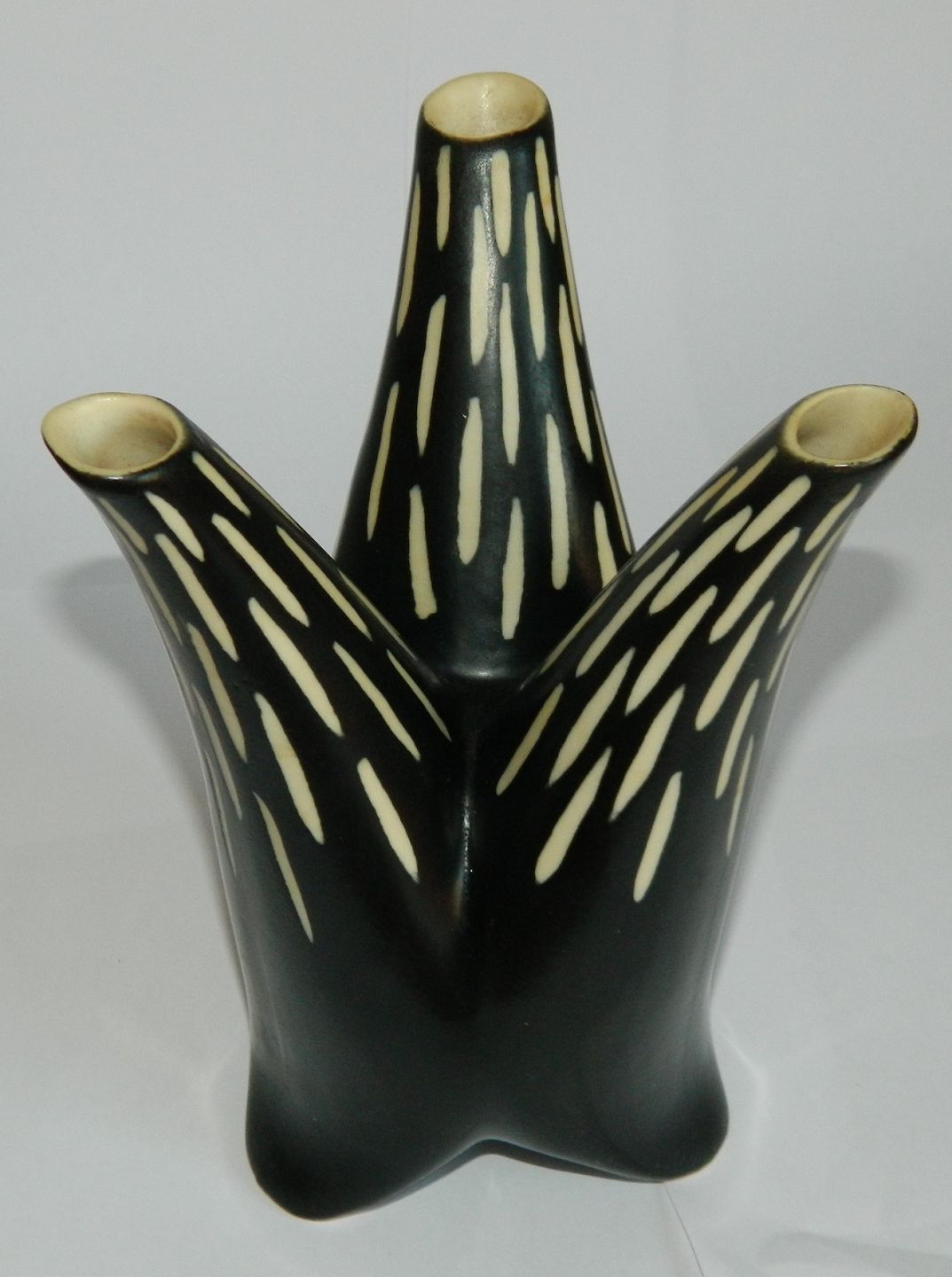 Organisk form fra Aksini i Danmark: Vase i keramik med tre halse og tre fødder ! Sort med hvide stafferinger. Designet af grundlæggeren Aksel Sigvald Nielsen (1910-1988), der indtil han grundlagde sit værksted 1954 havde arbejdet for den danske vestsjællandske keramikfabrik Knabstrup. Vasen fremstår i perfekt stand uden skader eller reparationer. Fabriksmærket på undersiden. Læg mærke til at navnet udspringer af grundlæggerens navn ! Vasen er 16 cm høj.