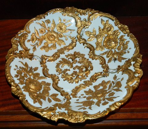 Stort fad i porcelæn fra Meissen, Tyskland, fra begyndelsen af 20. århundrede. Dekoreret med blomster i guld. Fremstår i perfekt stand. Ingen brugsslid på guldbelægningen. 5½ cm høj og 31 cm i diameter.