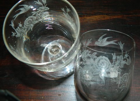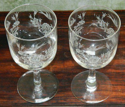 Pair of old glass with etched decoration with "birds" from Kastrup Glassworks made about 1910. Both glass in good condition with no damage or repairs. The decoration also in good condition without wear. Both glasses are "ball-milled" on the underside. 16 cm high.