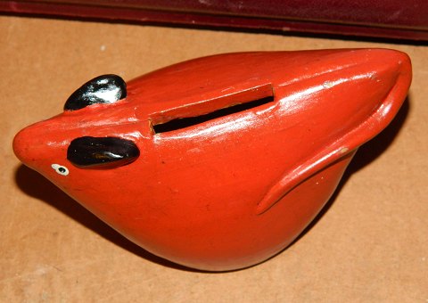 Rød bemalet mus i keramik som sparegris. Fremstår i god stand. 6½ cm høj og 11½ cm lang.
